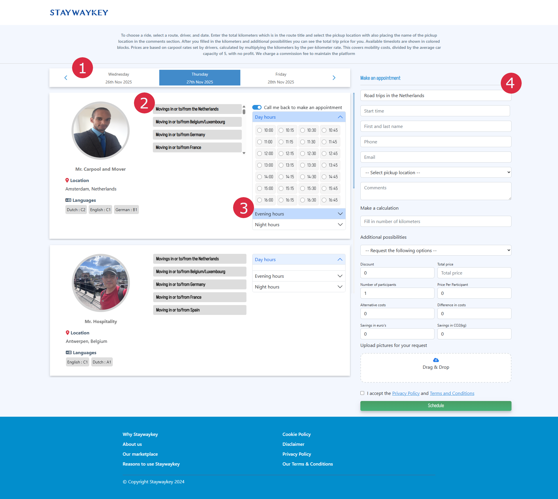 4. Enter your details including kilometers (from Amsterdam Sloterdijk to your destination and back), extra services, hours, and passengers.